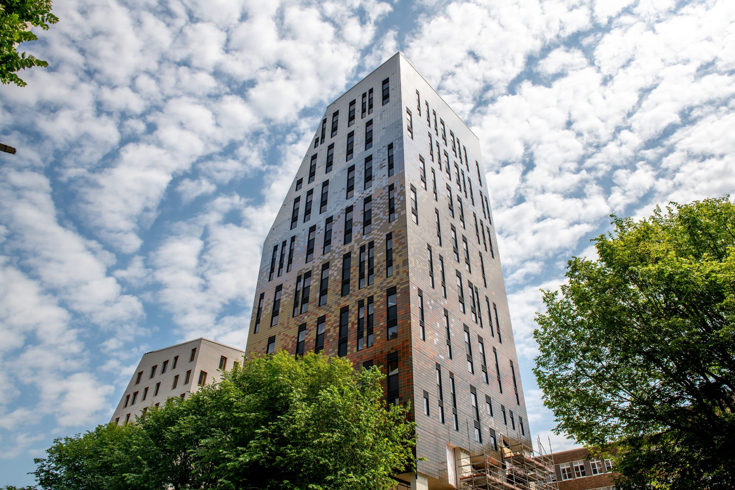 The five new towers at the Moulsecoomb Campus, ranging in height from eight to eighteen floors, provide over 800 affordable student bedrooms and space at ground level for a new Students’ Union and fitness facilities.